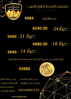 شهدت أسعار الذهب اليوم في مصر استقرار ملحوظا اليوم السبت 15 نوفمبر 2025، لتواصل التحرك الهادئ بعد موجة تذبذب ملحوظة خلال الأيام الماضية، بينما ظل عيار 21 – الأكثر تداولاً في السوق المحلية – عند مستوياته السابقة دون تغيير.
