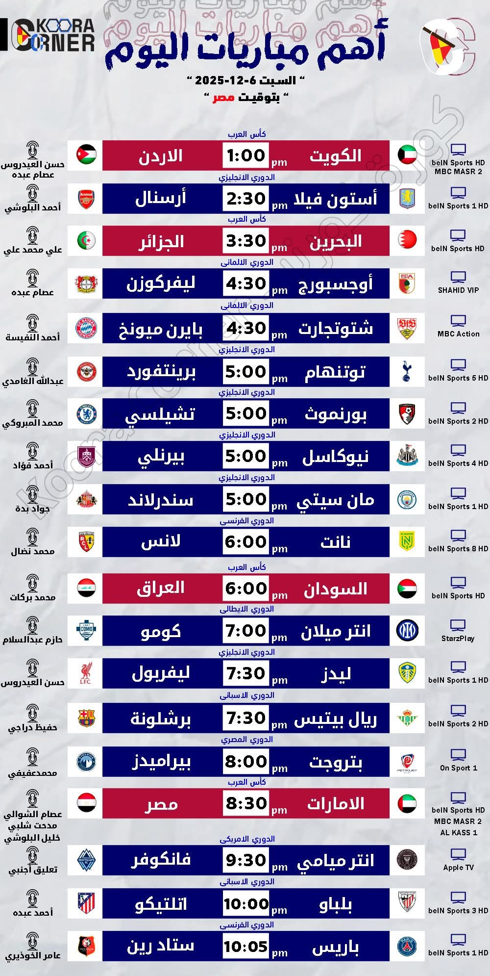 تنطلق اليوم السبت الممتاز 6 ديسمبر، مباريات الدوريات الاوروبية، الإنجليزي الإسباني والالماني والدوري المصري وكاس العرب بقطر.